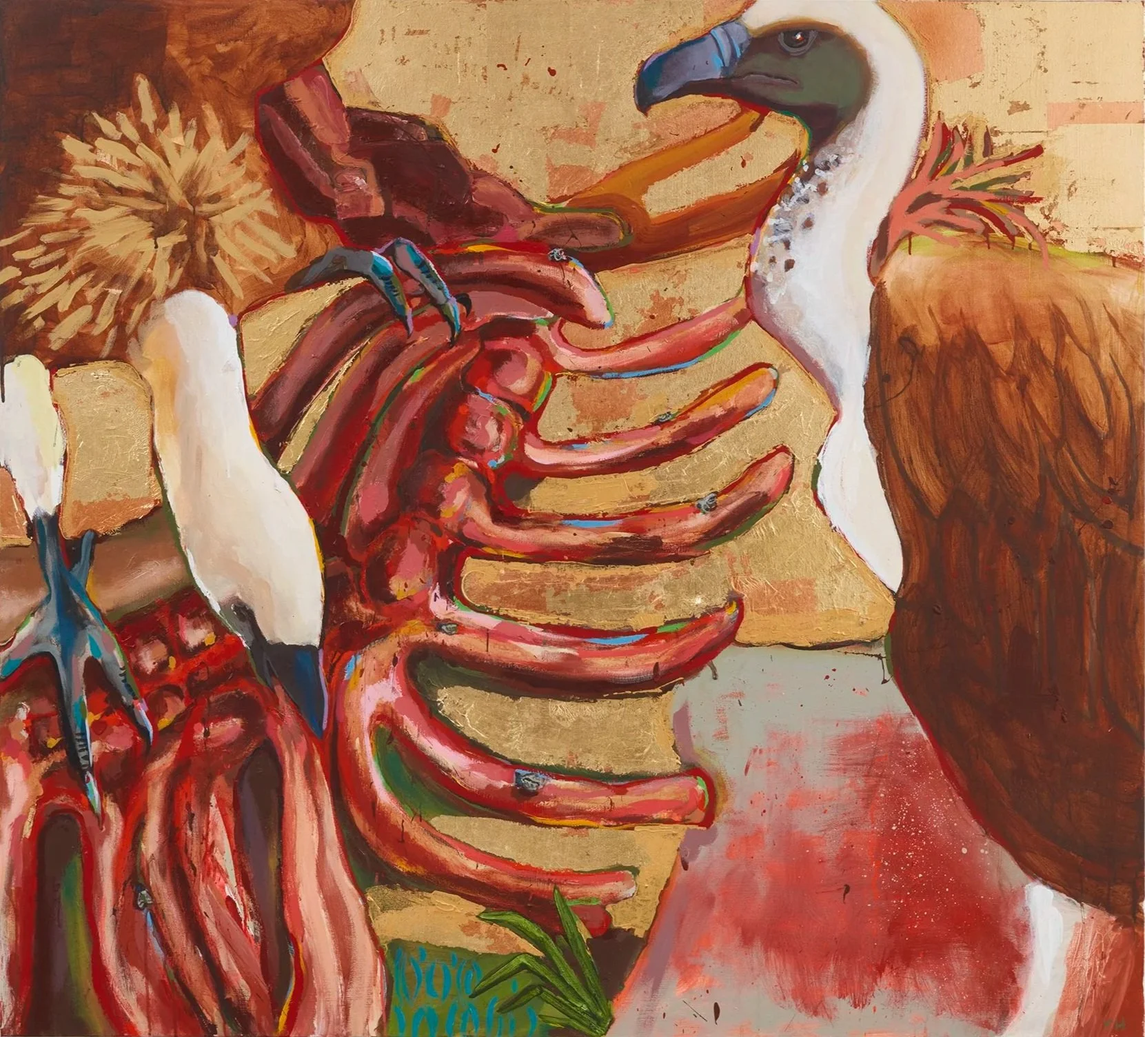 2025, 55” x 61” Acrylic, gold and copper leaf on canvas